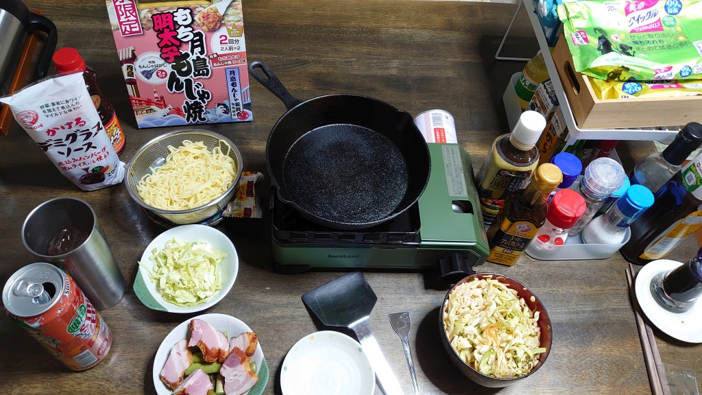 丁度キャベツも在庫してたしベーコンもあったので、一昨日届いたコンロ*1にスキレットで一人もんじゃ&鉄板開始(゚∀゚)