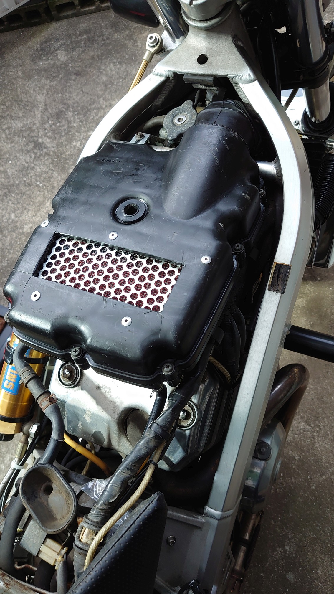 タンクを降ろしている間にと思っていた補修したエアクリーナボックスの取り付けと、冷却水の交換が完了。