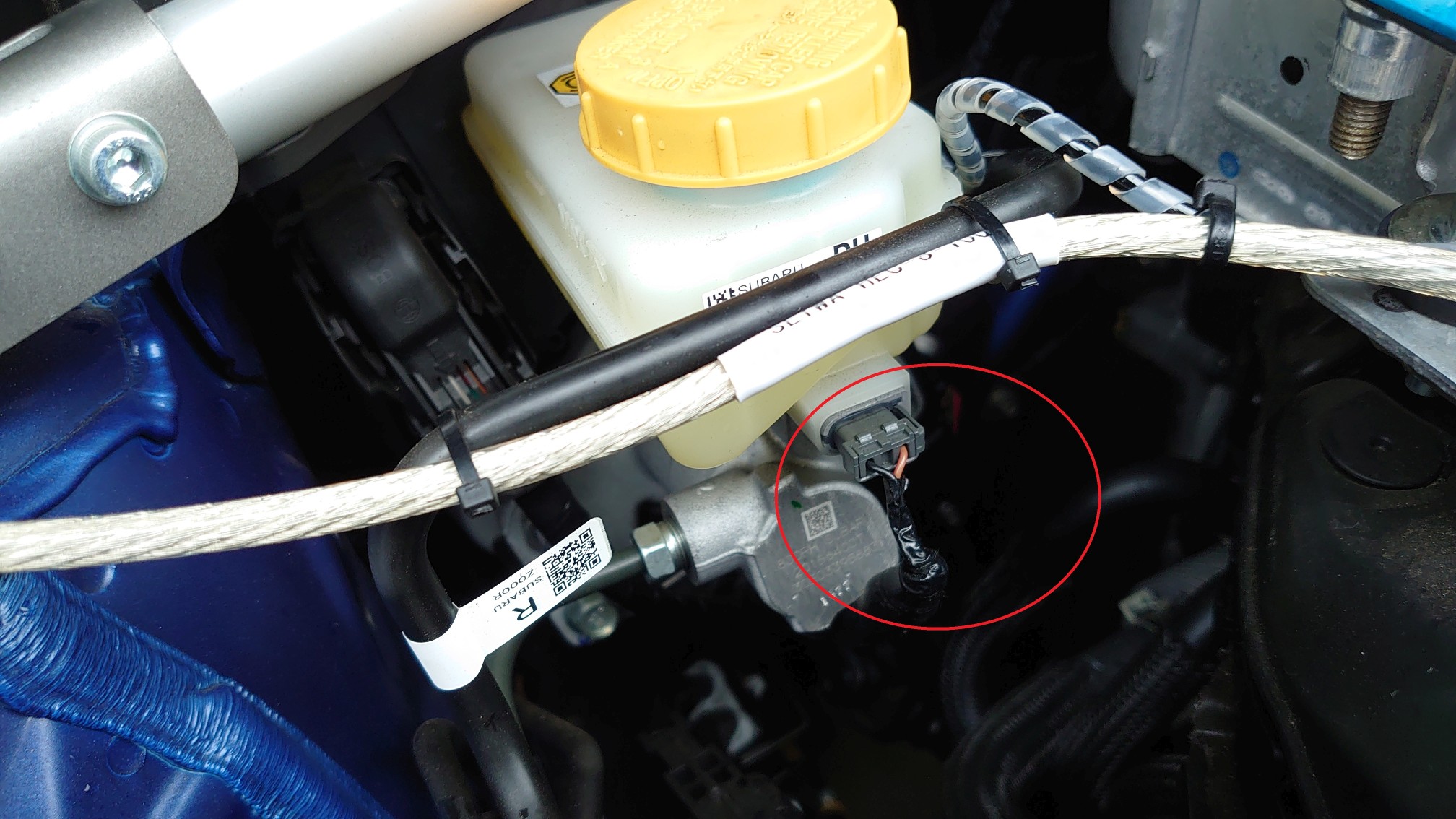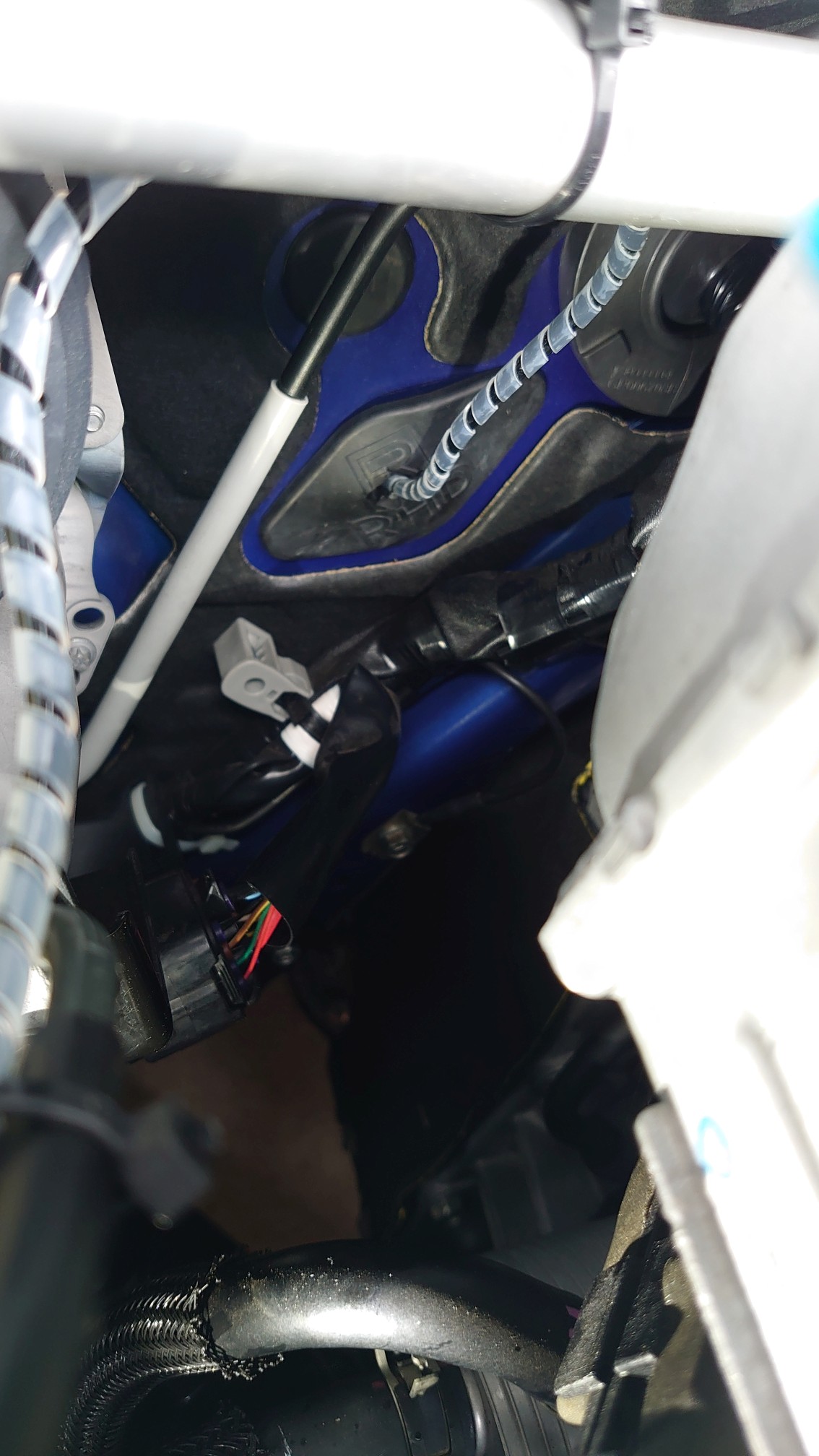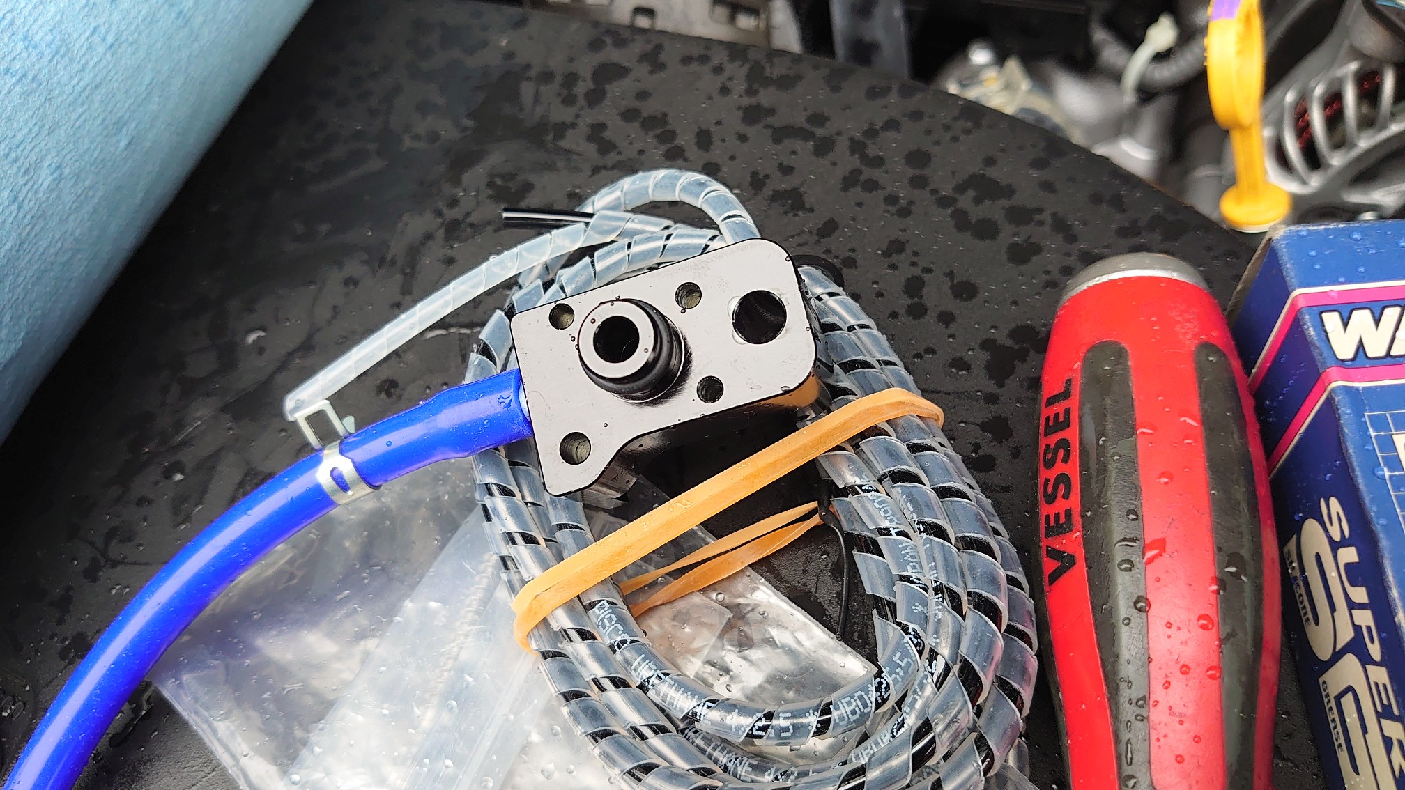 センサ付属の細チューブ、危なっかしいのでスパイラル巻いて、バルクヘッドの通線穴から通して車内のセンサに接続。