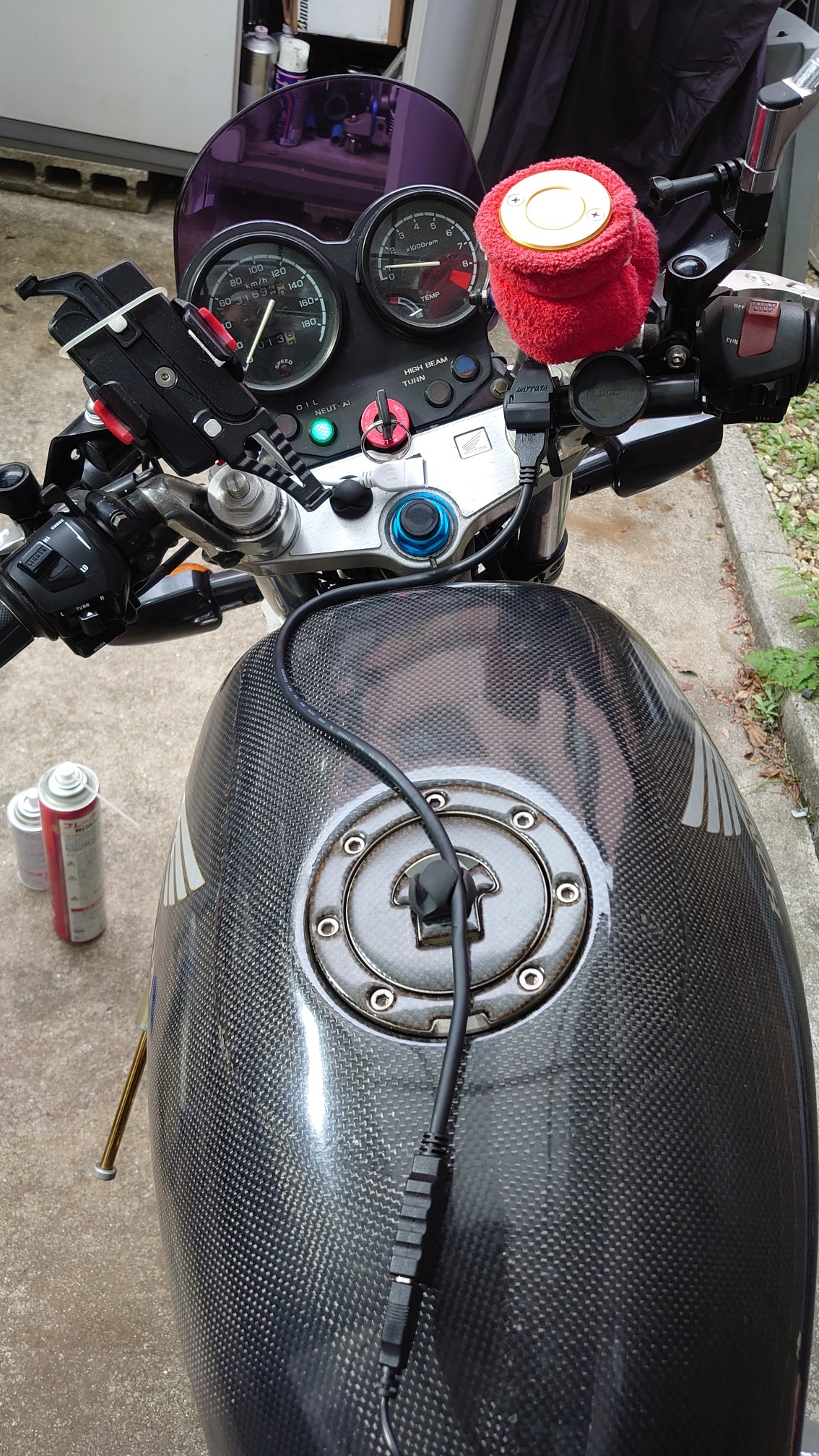 そうでなくてもスマホホルダと干渉して使いにくかったので、密林でアングルのUSB中継ケーブル調達したり、右ハンドルにも一口を追加したり。