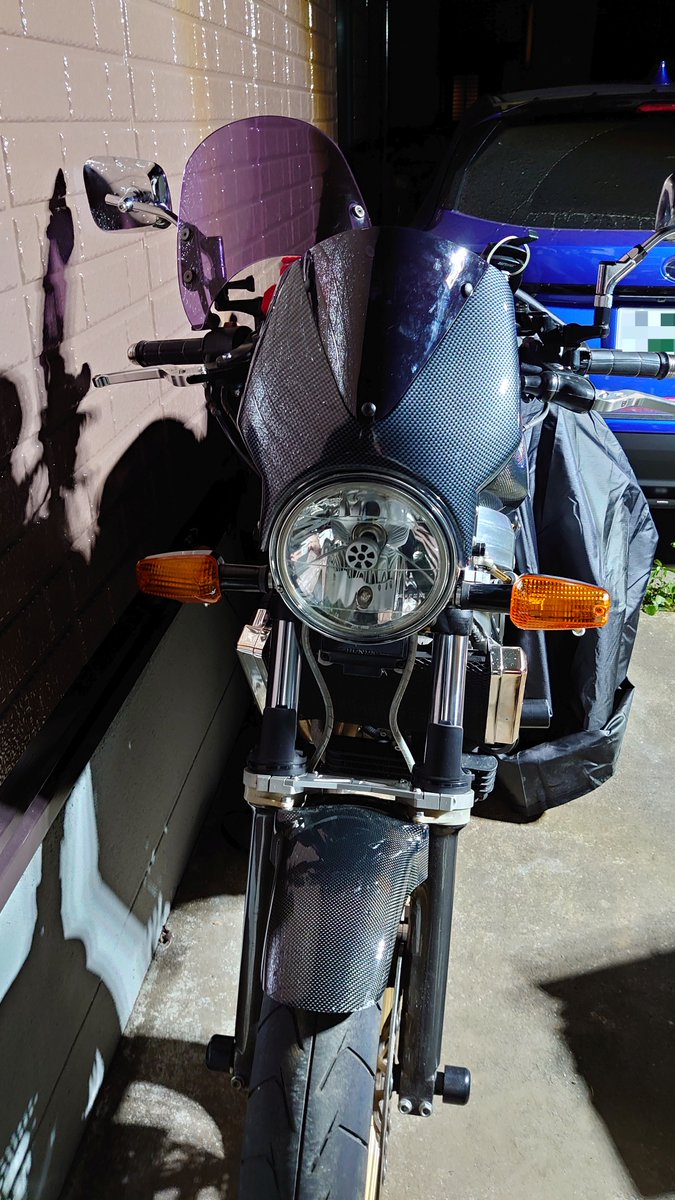 オクで程度の良いプーチのビキニカウル入手したので、30年選手の「気持ちだけメーターバイザー」と交換。