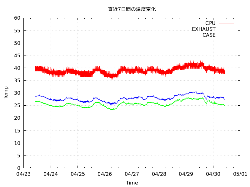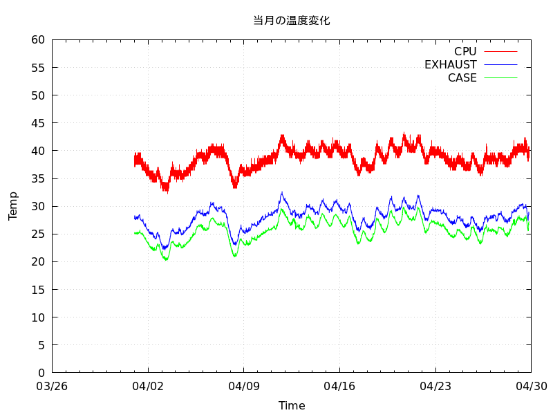あと、I2Cから温度読み出して記録するツールも毎分起動なので、crontabに「sleep 15;/usr/local/etc/ほげほげ.plt」で遅延させないと結構な割合でエラーになるw